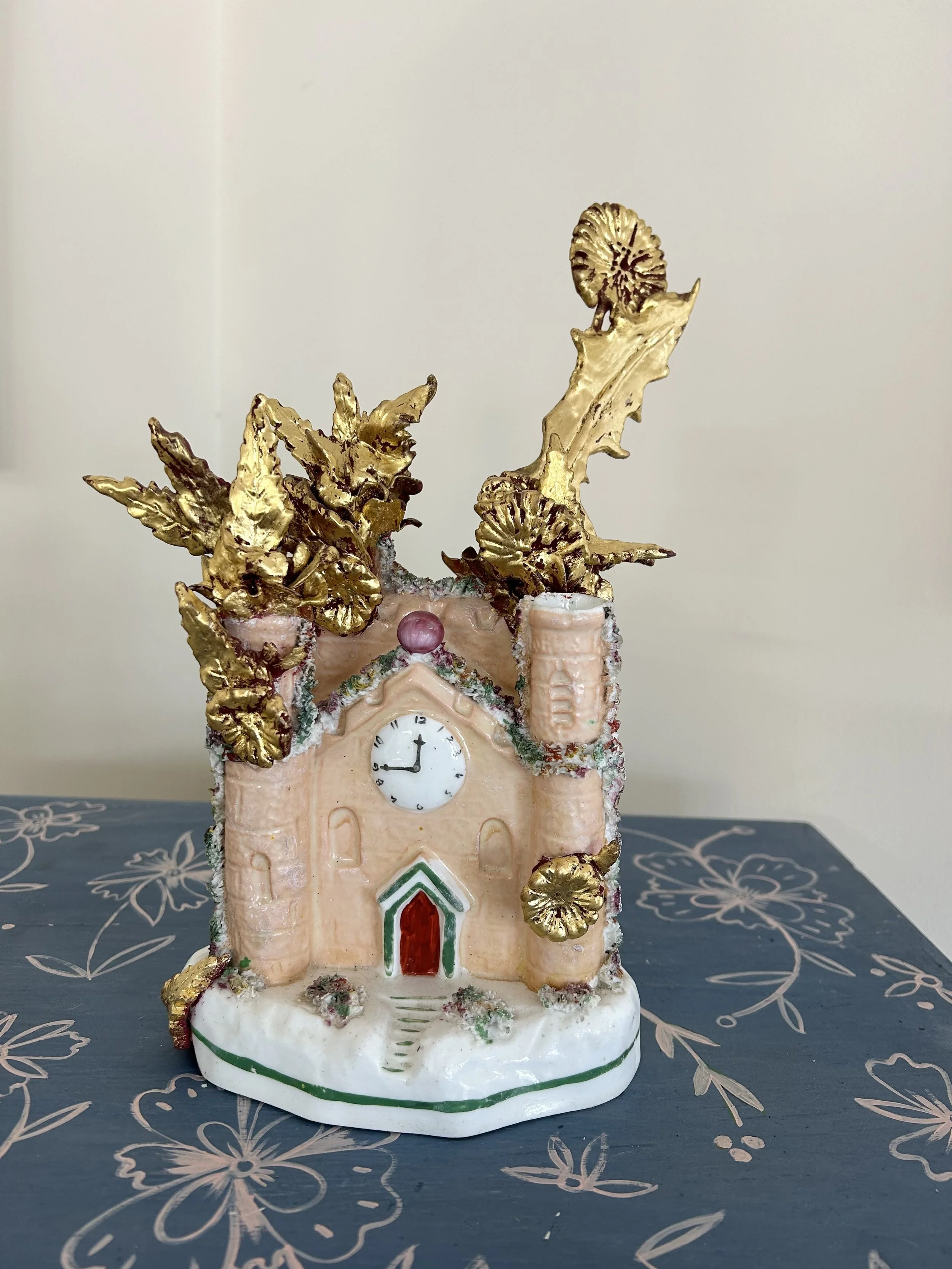 A collection of Extreme Kintsugi works made by Amy Douglas in 2023. Gessoed and gilded dandelions and daisies repair the cracks in these Pastille burners. Prices range form £250 -£350